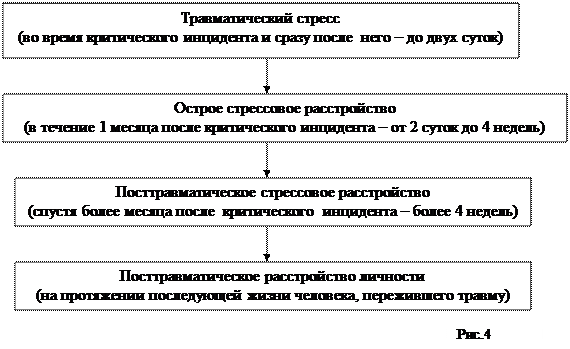 Посттравматическое стрессовое расстройство откладывает отпечаток на всю дальнейшую жизнь человека, потому требуется проработка данного состояния для сглаживания последствий данного расстройства. Схематически взаимосвязь различных по времени возникновения, продолжительности и глубине стадий формирования постстрессовых нарушений представлена на следующей схеме (рис.4)