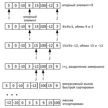 Объяснение: введем два индекса i и j, в начале алгоритма они указывают, соответственно, на левый и правый конец последовательности. Начнем двигать указатель i с шагом 1 по массиву вперед, пока не будет найден элемент со значением большим или равным значению опорного элемента. Затем аналогичным образом двигаем указатель j от конца массива к началу, пока не будет найден элемент со значением меньшим или равным значению опорного элемента. Далее, если i<=j, меняем найденные элементы местами и продолжаем двигать i и j. Алгоритм разделения заканчиваем тогда, когда индекс i становиться больше индекса j. После разделения все значения до индекса i меньше или равны опорному элементу, а все значения после индекса j больше или равны опорному элементу. Далее рекурсивно вызываем метод быстрой сортировки отдельно для каждой из частей массива. Пример выполнения алгоритма быстрой сортировки массива {5, 0, -10, 9, 15, 100, -12, 3} иллюстрирует рис. 6.5. На рисунке показан только первый шаг рекурсии. На самом деле подмассивы {5, 0, -10, 3, -12} и {100, 15, 9} сортируются затем рекурсивно. Условием завершение рекурсивных вызовов является наличие одного элемента в каждой из частей массива.