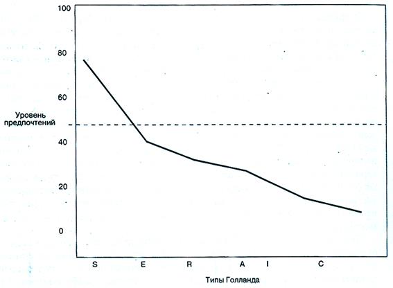 Заключительный этап оформления результатов тестирования состоит в наглядном представлении их в графическом виде (Strahan & Kelly, 1994). Графическое представление данных помогает клиентам увидеть результаты тестирования в простом, понятном и содержательном виде. Например, если интерпретированные по Голланду данные Опросника профессиональных интересов Стронга (SVIT) разместить в порядке убывания уровня предпочтения, результаты отдельного профиля могли бы оказаться похожими на следующий рисунок.