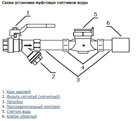1. кран шаровой, 2 – фильтр сетчатый, 3. – патрубки, 4 – присоединительный комплект, 5 – счетчик воды, 6 – клапан обратный