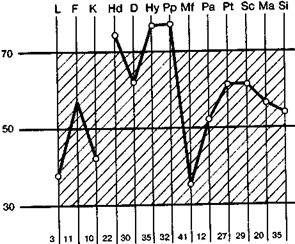Большинство личностных тестов имеет характер опросника: таковы MPI [Н. Eysenck, 1959] и 16PF [R. Cattell и соавт., 1957]. Наибольшее распространение получил тест MMPI [S. Hathaway и J. McKinley, 1963], который содержит 566 вопросов и пытается охватить клинически определяемые черты личности (ипохондрические, истерические, психопатические свойства, тенденции маскулинизации-феминизации, параноидные, психастенические, шизоидные и маниакальные черты, а также социальная инверсия). Для психосоматических синдромов характерен зубец «V» в MMPI (рис. 6).