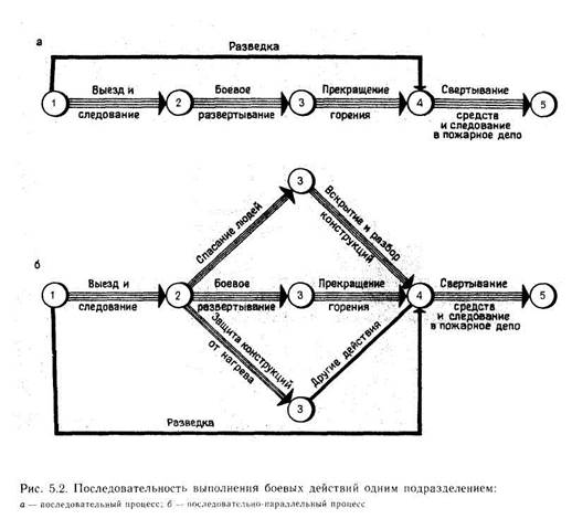 тоянными, т. е. осуществляются при аждом вызове на пожар, например, ледование на пожар и обратно в по-<арное депо, разведка пожара, боевое азвертывание, прекращение горения. 1ругие же виды боевых действий, апример спасание людей, удаление ыма, вскрытие конструкций, защита х от воспламенения и обрушения, не вляются постоянными и выполняются е на всех пожарах. Поэтому все юевые действия подразделений (рис. .1) подразделяются на общие и частые. Общие боевые действия выпол-яются в строгой последовательности рис. 5.2, а). Частные боевые дейст-,ия выполняются параллельно с неко-орыми общими и, как правило, |дновременно с боевым развертывани-■м и прекращением горения. В этом лучае боевые действия относятся к юследовательно-параллельным провесам (рис. 5.2, б).