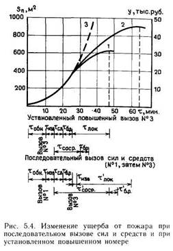 Таким образом, при повышенном номере вызова подразделений для ликвидации пожара на складе тары доля ущерба от пожара, приходящаяся на время сосредоточения сил и средств, примерно составляет 15 тыс, руб., или 48%, а при последовательном вызове сил и средств — 35 тыс. руб., или 75%. Следовательно, одним из мероприятий, обеспечивающих быстрое сосредоточение сил и средств на пожаре и снижение ущерба от него, является установление повышенных номеров вызова подразделений пожарной охраны на объекты. В настоящее время такая система номеров вызова устанавливается на многих объектах городов, однако и она при позднем обнаружении пожара не может существенно снизить ущерб. Положение ухудшается еще и тем, что с увеличением интенсивности движения в городах уменьшается скорость движения пожарных автомобилей. Из рис. 5.4 видно, что сокращение ущерба от пожаров, а следовательно, и ущерба, приходящегося на время сосредоточения сил и средств, можно получить путем уменьшения времени свободного распространения горения. Этого можно добиться путем внедрения на объектах установок автоматического обнаружения пожаров, а на некоторых объектах внедрения также установок автоматического пожаротушения.