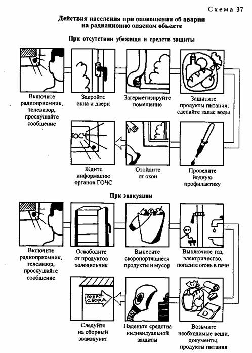 В ходе подготовки к эвакуации необходимо внимательно слушать передачи местного телевидения и радио, по которым будет сообщено, когда и к каким мерам защиты следует прибегнуть (схема 37).