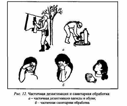 При нахождении на улице применять средства защиты органов дыхания и кожи, по возможности не поднимать пыль, стараться не ставить чемоданы или рюкзаки на землю или использовать при этом чистую газету или любую другую подстилку. Избегать движения по высокой траве и кустарнику, без надобности не садиться и не прикасаться к местным предметам. В процессе движения не пить, не принимать пищу и не курить. Перед посадкой в автомобиль провести частичную дезактивацию средств защиты кожи, одежды и вещей их осторожным обтиранием или обметанием, а также частичную санитарную обработку открытых участков тела обмыванием или обтиранием влажной ветошью (рис. 12).