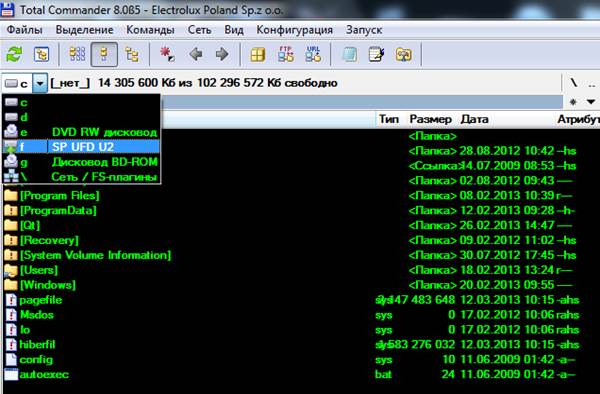 - В левом углу, нажимаем на стрелочку, и выбираем название своей флехи (в моем случаи это SP UFD U2).