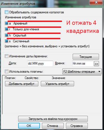 - Чтобы выделить все файлы нажимаем Ctrl+A и сразу же переходим в Файлы – Изменить атрибуты.