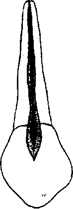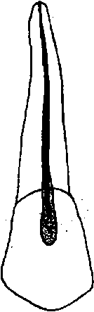 Немалые трудности при эндодонтическом лечении пульпита и периодонтита представляютнижние центральные и латеральные резцы в связи с уплощенными в медио-дистальном направлении корнями. Это особенно четко прослеживается у латерального резца (рис. 66). В 60% случаев корневые каналы резцов нижней челюсти имеют форму каналов I типа, в 35% случаев — II типа и только в 5% — III типа. Нижние резцы после моляров представляют наибольшую сложность при эндодонтическом лечении. Если в резцах имеется один корневой канал, то он обычно сужен в медио-дистальном направлении, имеет восьмиобразную форму и постепенно суживается по направлению к верхушке корня (рис. 6а, б).