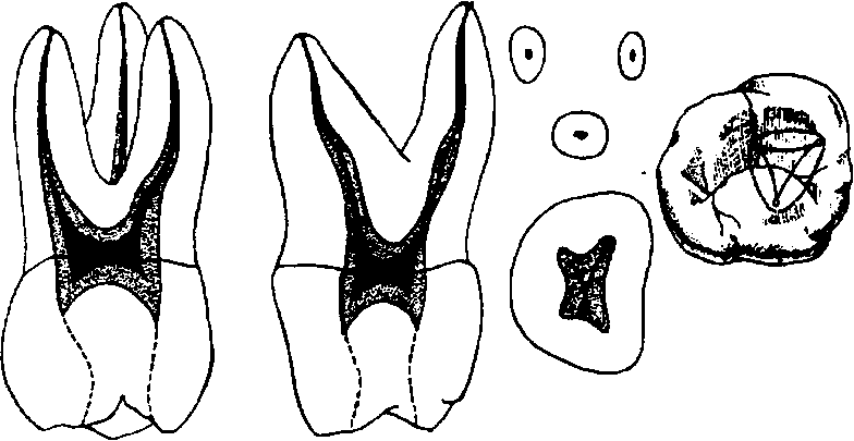 форму полости первого моляра, сплюснутую в шечно-небж направлении. Корни и корневые каналы (их три) обычно
