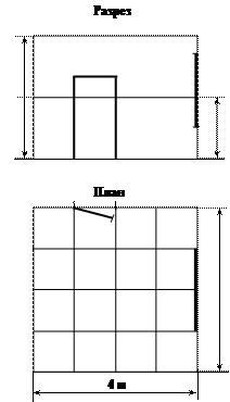 Как видно из плана и разреза, площадь комнаты 4 × 4 = 16 м2. Высота потолка – 3 м. Дверь находится на фронтальной стене на расстоянии 1 м от левой стены. Ширина двери – 1 м, высота – 2 м. Окно расположено на правой стене и удалено от фронтальной стены на 1 м. Высота окна – 1,8 м, ширина – 2 м. Расстояние от пола до окна – 0,75 м, ширина подоконника – 0,3 м. Определим исходные данные для построения перспективы интерьера: размеры картины, условный масштаб, положение линии горизонта и дистанционной точки.