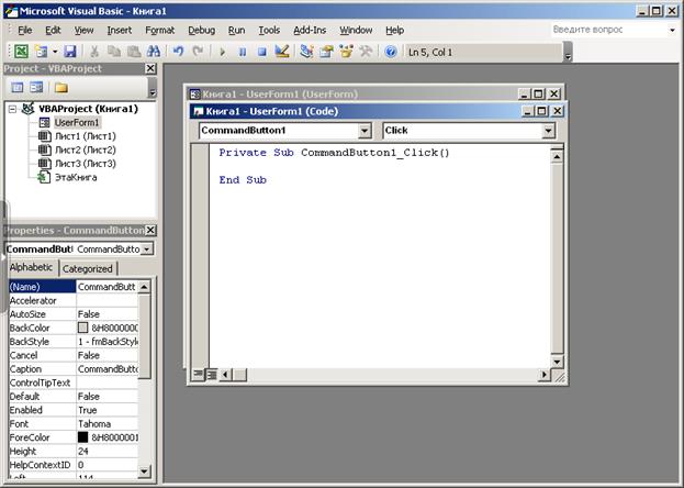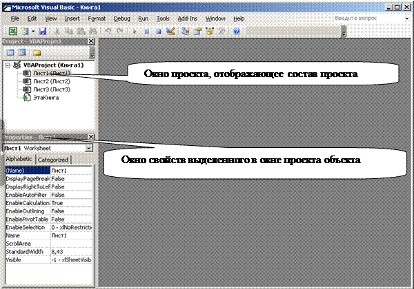 3. Открывается окно редактора (рис1), при этом создается проект VBAProject(Книга1)