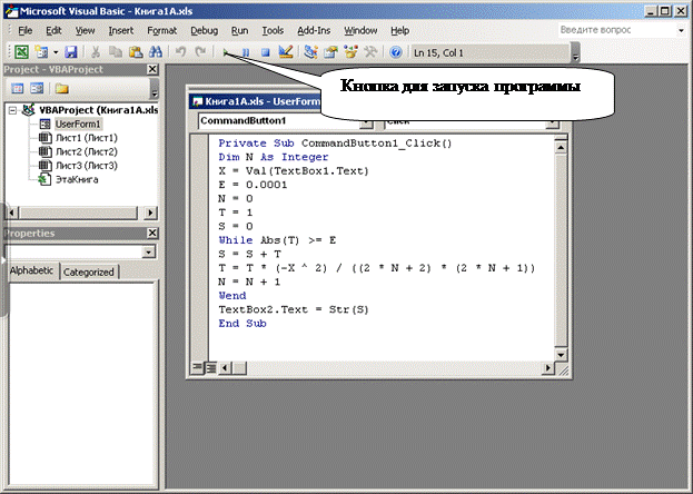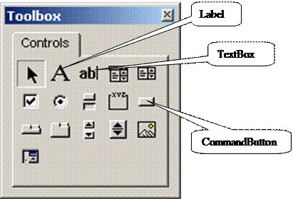 Label – для создания надписей, TextBox, - для ввода/вывода данных, CommandButton – кнопка для запуска какого-либо процесса (в нашем случае расчета)