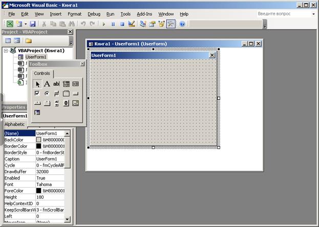 4. В окне редактора включаем пункты меню «Insert, UserForm», появляется окно пользовательской формы UserForm1 и рядом с ним панель инструментов ToolBox для нее (рис.2):
