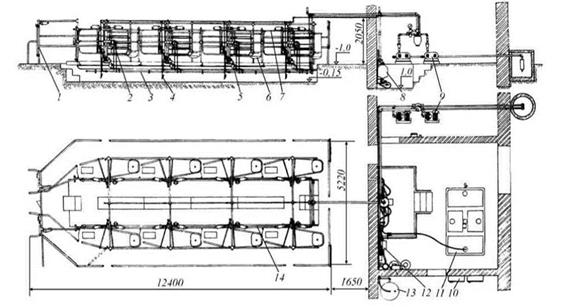 8 – оборудование молочной; 9 –Вакуумная установка, 10 – шкаф управления; 11 – танк-охладитель молока; 12 – охладитель молока; 13 – Водонагреватель; 14 - кормораздатчик