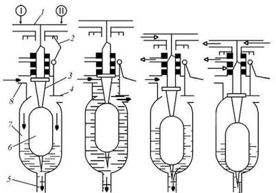– исходное положение – головка 3 (рис. 3.21, а) установлена на скобе 2, жидкость поступает в пневмодатчик через шланг 8, заполняет камеру 7 и выливается через калиброванное отверстие 5;