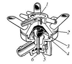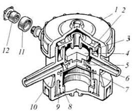 | 1 - гайка: 2 - прокладка: 3 - крышка; 4 - клапан; 5 - обойма; 6 - мембрана; 7 - корпус; 8 - корпус камеры управления; 9,10 - уплотнительные кольца; 11 - кожух фильтра воздуха; 12 - гайка фильтра Рисунок 3.3 – Пульсатор доильного аппарата | 1 - распределитель; 2 - корпус; 3 - резиновый клапан; 4 - крышка; 5 - резиновая шайба; 6 - шплинт Рисунок 3.4 – Коллектор доильного аппарата |