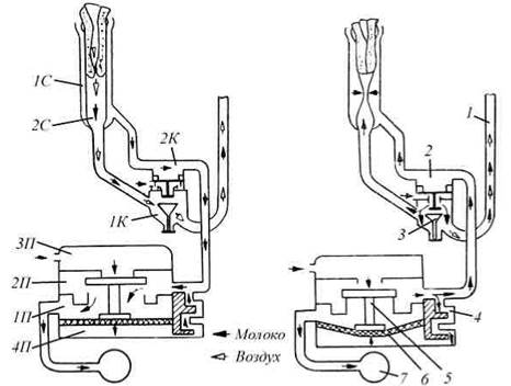 При включении аппарата мембрана 2 пульсатора поднимает клапан 1, который перекрывает доступ атмосферному воздуху из камеры 3П и обеспечивает отсоединение камеры 1П с камерой 2П. Вакуум из камеры 1П через камеру 2П проникает в межстенные пространства доильных стаканов 10 через распределитель коллектора 4К. Оператор, поднимая за шайбу 3 клапан 4, фиксирует его шайбой в пазах прозрачного пластмассового корпуса коллектора, открывая при этом связь молочной камеры коллектора 2К с камерой 1К, находящейся под постоянным вакуумом. Доильные стаканы одевают на соски вымени в момент такта сосания, когда в межстенных и подсосковых камерах стаканов находится рабочий вакуум. Такт сжатия формируется в пульсаторе при опускании клапана 5 и поступления воздуха из камеры 3П в камеру 2П и далее в межстенные камеры стаканов через распределитель коллектора 4К. Давление в камерах 3К и 4К выравнивается и под действием атмосферного давления в камере 3К на площадку клапана 11 он опускается, открывая доступ воздуху из камеры 3К в молочную камеру и в подсосковые камеры доильных стаканов, понижая в них вакуум до 12 кПа. Воздух в молочных камерах доильных стаканов содействует быстрому опорожнению молочного шланга 6. В пульсаторе воздух из камеры 2П по каналу 8 дросселя 9 переходит на камеру 4П. Разность давлений, возникающая в камерах 4П и 1П, поднимает мембрану 2 и клапан 1 перекрывает камеру 3П, открывая путь вакууму в камеру 2П и далее шланг 6, камеру 4К и в межстенные камеры стаканов. Мембрана 7 коллектора поднимается под давлением воздуха из камеры 3К. Подсосковые камеры, лишенные подсоса воздуха из камеры 3К, вакуумируются до глубины рабочего вакуума. Повторяется такт сосания.