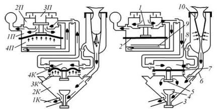 Схема работы двухтактного доильного аппарата АДУ-1 дана на рис.3.5. При такте сосания вакуумметрическое давление из вакуумпровода 7 по камере 1П пульсатора поступает в камеру 2П и далее через распределитель 2К коллектора в межстенные камеры 1С доильных стаканов. Одновременно из молокопровода по молочному шлангу 1 через камеру коллектора 1К в подсосковые камеры 2С доильных стаканов подается постоянный вакуум, и молоко отсасывается из сосков вымени.
