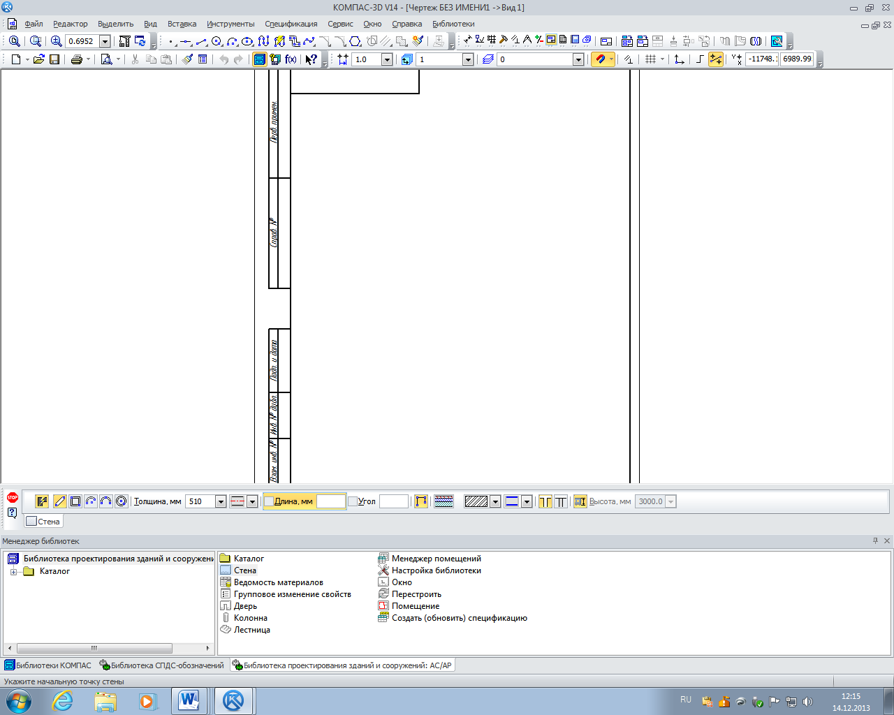 Прямолинейная стена создаётся аналогично Отрезку КОМПАС-ГРАФИК: заданием начальной и конечной точек; заданием начальной точки, длины и угла наклона. Также есть режим непрерывного ввода объектов, включить/выключить который можно с помощью соответствующей кнопки или сочетанием клавиш Ctrl + W.