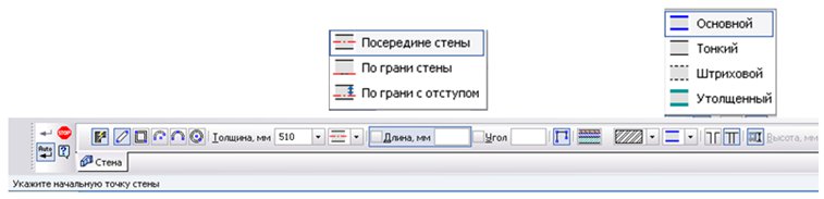 Панель включает в свой состав 5 основных кнопок, определяющих вид представления на чертеже новой стены и их общие параметры такие как: изменение толщины (для однослойных стен), изменение привязки стены к базовой линии, штриховки и быстрый выбор стилей отрисовки контура стен. Остальные поля ввода определяют геометрию стены в зависимости от выбранного вида.