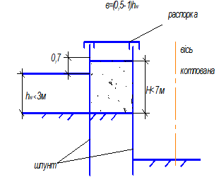 Однорядные и двухрядные (рис.3) шпунтовые перемычки устраиваются когда скорость течения воды превышает 1м/сек., глубина воды 3-5 м и отсутствует пригодный грунт для грунтовых перемычек.