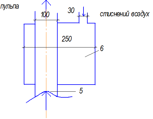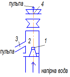 Принцип работы иідроэлеватора (рис.5): напорная струя воды, выходя из насадки (1) с большой сскоростью, создает в камере (2) вакуум, под действием которого по всасывающей трубе (3) в камеру смешения поступает пульпа. Далее пульпа идет в диффузор (4) и наверх.
