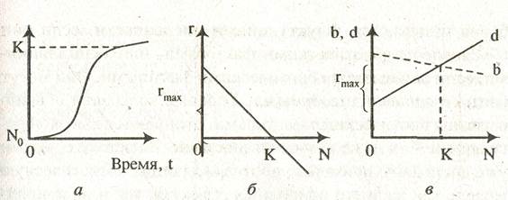 Рис. 3. Логистическая модель роста популяции: а — кривая роста численности ( N ); б — зависимость удельной скорости роста (r) от численности ( N ); в — зависимость рождаемости ( b ) и смертности ( d ) от численности; К — предельная численность