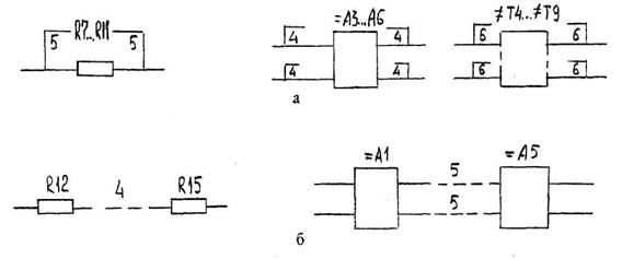 На рис.14 представлено изображение на схеме параллельного (рис.14, а) и последовательного (рис.14, б) соединения одинаковых элементов, устройств или функциональных групп. При параллельном соединении допускается вместо изображения всех ветвей параллельного соединения изображать только одну ветвь, указывая количество ветвей с помощью обозначения ответвления. Позиционное обозначение элементов, устройств функциональных групп проставляется с учетом всех ветвей, входящих в параллельные соединения. При последовательном соединении вместо изображения всех последовательных соединенных элементов, устройств допускается изображать только первый и последний элементы, показывая электрические связи между ними штриховыми линиями. Над штриховой линией указывают общее количество одинаковых элементов. В позиционных обозначениях при этом должны быть учтены элементы, устройства и функциональные группы, не изображенные на схеме.
