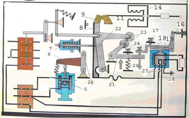 Механизм защёлки и контактный рычаг.Механизм защёлки состоит из двух качающихся рычагов 21 и 22, на концах которых укреплены ролики 23. Расположение осей вращения роликов выбрано таким образом, чтобы обеспечивалось силовое давление роликов при замкнутой защёлке. На рычаге 2 защёлки шарнирно закреплен контактный рычаг 9 с подвижным контактом. Контактный рычаг, в свою очередь, механически шарнирно соединён с отключающими пружинами 7, аэлектрически - с катушкой 27 отключающего электромагнита.