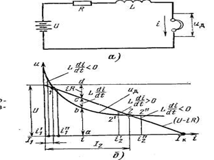 Для тока I отрезок аb соответствует напряжению на дуге, отрезок cd— падению напряжения на резисторе R и отрезок bс соответствует L di/dt. Очевидно, что в точках 1 и 2 L di/dt =0. В этих точках возможен стационарный режим. Рассмотрим более подробно равновесие напряжений вблизи этих точек. Если по каким-либо причинам напряжение источника питания снизится, то точка равновесного состояния перейдет в 2', при этом ток уменьшится до значения i2', определяемого пересечением ВАХ с прямой U',— iR.