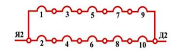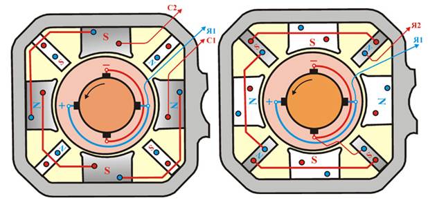 По эквивалентной схеме проследим последовательность соединения обмоток главных и добавочных полюсов двигателя ЭД118А(рис.1.31). Тяговый двигатель последовательного возбуждения имеет четыре главных и четыре добавочных полюса. Обмотки на главных и добавочных полюсах соединены последовательно соответственно. Обмотки якоря и добавочныхных полюсов соединены последовательно внутри двигателя, и это соединение особых выводов не имеет. Выводы Я1 и Я2 объединяют не только обмотку якоря, но и обмотку добавочныхных полюсов. Обмотка главных полюсов имеет самостоятельные выводы С1 (начало) и С2 (конец), которыми она включается в схему локомотива. Синим и красным цветом на катушках полюсов обозначены соответственно начало и конец обмотки полюса. Иногда началу обмотки соответствует буква Н, а концу - К.