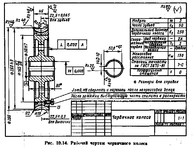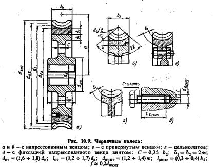 Червячные колеса изготовляют обычно составными: венец — бронзовый, центр — чугунный, чугун марки СЧ 15. Венцы соединяют с центрами либо посадкой с натягом (рис. 10.9, а и б), либо болтами, поставленными без зазора в отверстия из-под развертки (рис. 10.9, в).
