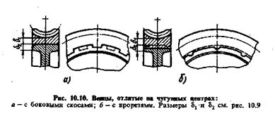Соединение венца с центром можно осуществить отливкой бронзового венца в литейную форму, в которую заранее устанавливают чугунный центр. Во избежание проворота венца на боковых поверхностях центра делают пазы, заполняемые металлом венца при отливке (рис. 10.10).