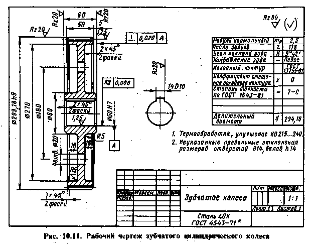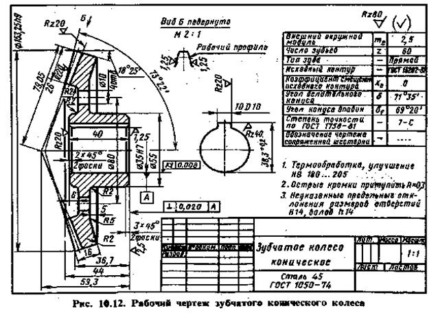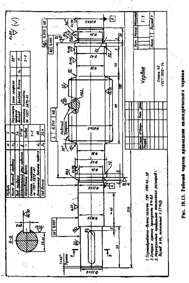 На рис. 10.11 и 10.12 приведены рабочие чертежи цилиндрического и конического зубчатых колес в соответствии с требованиями ЕСКД (ГОСТ 2.403-75), а на рис. 10.13 и 10.14 рабочие чертежи червяка и червячного колеса (ГОСТ 2.406 — 76). Стандарт устанавливает обозначение архимедова червяка — ZA.