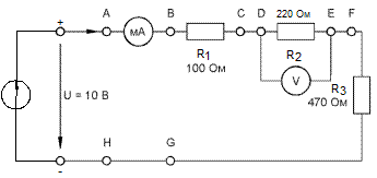 · Затем измерьте частичные напряжения (падения напряжения) между точками B - C, D - E, F - G, а также полное напряжение цепи между точками B – G. Все измеренные величины занесите в табл. 4.7.1.