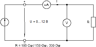· Подайте на схему напряжения, указанные в табл. 4.2.1 и запишите результаты измерений. Убедитесь, что P = U×I и R = U / I.