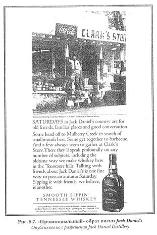 • Виски Jack Daniel's вобрало в себя характерные особенности штата Теннесси, чтобы создать индивидуальность, которая отражает ритм жизни и «аромат» провинциальной культуры этого штата (рис. 5-7). Результатом являются достижение в восприятии клиентов образа «аутентичности» (подлинности) бренда и укрепление связей с клиентами. Например, у Jack Daniel's есть свой клуб Сквайров, члены которого владеют участками земли размером со спичечный коробок в глуши Теннесси и регулярно получают отчеты о состоянии их собственности.