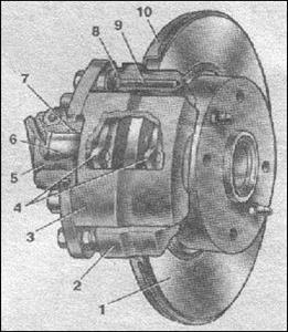 Рис. 4. Тормозной механизм переднего колеса: 1 – тормозной диск; 2 – направляющая колодок; 3 – суппорт; 4 – тормозные колодки; 5 – цилиндр; 6 – поршень; 7 – уплотнительное кольцо; 8 – защитный чехол направляющего пальца; 9 – направляющий палец; 10 – защитный кожух.