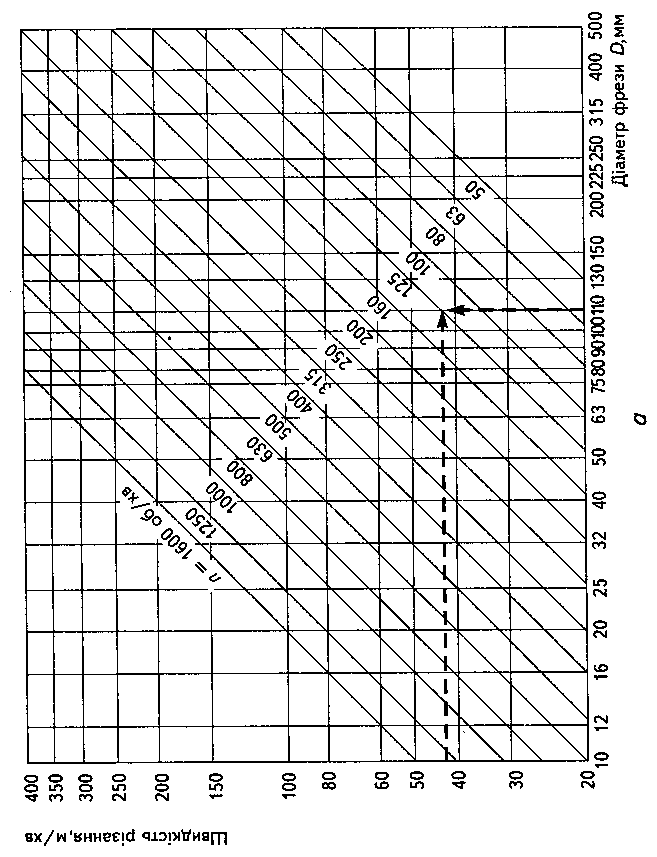 Рис 2.5 (а) Графік номограми для визначення частоти обертання фрези за швидкістю різання