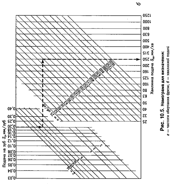 Графік номограми для визначення хвилинної подачі за призначеною подачею на зуб із десятьма зуб'ями та частоти обертів фрези за хвилину (рис. 2.5, б) використовують так: з точки, що відповідає призначеній подачі на один зуб, проводять лінію, вертикальну до перетину похилої лінії на графіку, що відповідає числу зуб’ів фрези. З цієї точки проводимо горизонтальну лінію до перетину похилої лінії, що відповідає частоті обертання фрези. З цієї точки проводимо вертикальну лінію вниз до перетину показників хвилинної подачі. На графіку пунктиром вказані такі показники: подача на один зуб 0,2 мм/зуб, число зуб’ів фрези 10, частота оберту фрези 125 об/хв, хвилинна подача 250 мм/хв.