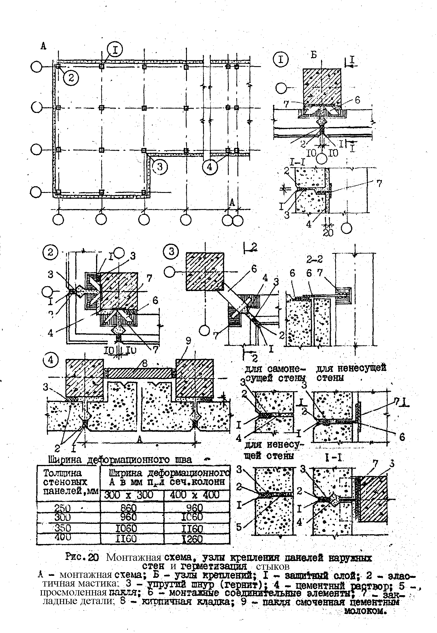 Панели самонесущих стен устанавливают в растворе и крепят поверху на сварке по закладным деталям к колоннам. Панели несущих стен устанавливают на ригели, консоли колонн или опорные металлические столбики в колоннах и закрепляют в трех точках - к одной из опор и поверху к колоннам каркаса. Горизонтальные стыки панелей ненесущих стен заполняют упругими прокладками. Изоляция стыков панелей решена по принципу закрытого стыка (рис.20).