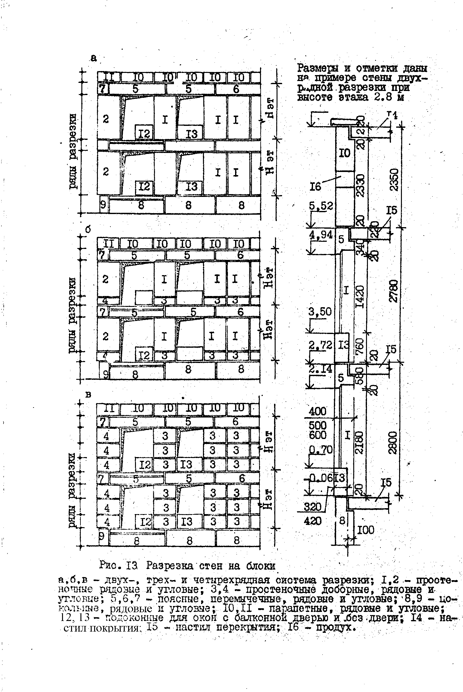 Наружные стены крупноблочных зданий в пределах высоты каждого этажа членят на два, три или четыре ряда блоков. Эти разрезки соответственно называются двух-, трех- и четырехрядными (рис.13).