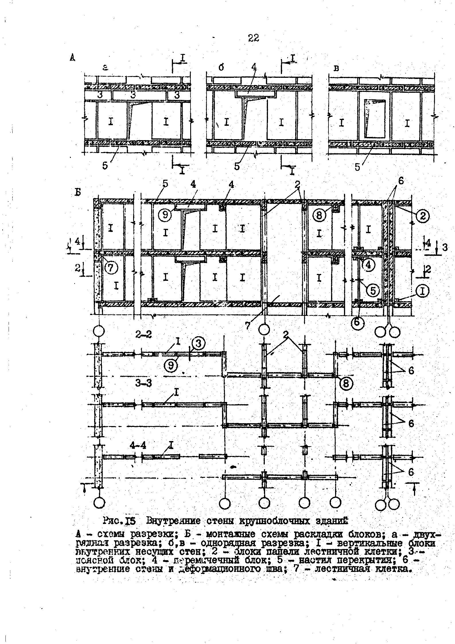 Внутренние стены из крупных блоков могут иметь в пределах высоты этажа однорядную и двухрядную разрезки на блоки (рис.15 .). При однорядной разрезке стены монтируют только из вертикальных простеночных блоков глухих и с дверными проемами (рис. 15, в). В случае применения только глухих блоков, дверные проемы устраивают установкой блоков с разрывом на ширину проема, а разрыв перекрывают перемычечным блоком (рис.15 , б).