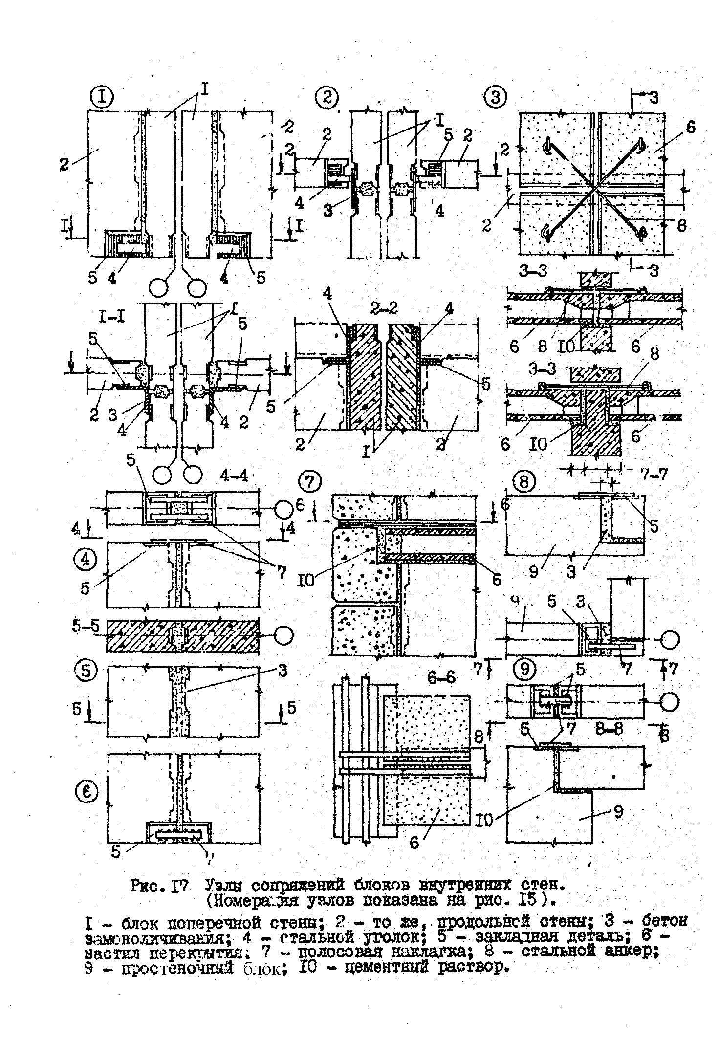 Основные узлы сопряжений блоков наружных стен одних с другими, перекрытиями и покрытиями представлены на рис. 16 и I7.