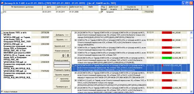 С 01.06.2011 при проверке договоров в Продаже Перевозок в список «кирпичиков» добавлена колонка (самая правая), в которой отображается номер участка, для которого этот «кирпичик» выполнился. Ранее при проверке зеленым цветом выделялись «кирпичики», которые срабатывали для участка перевозки с наименьшим номером. Таким образом, возникали ситуации, когда условие сработавшее для 2-го и более участка могло не отобразиться зеленым цветом.