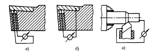 Количественную оценку тепловых процессов, происходящих в зоне стружкообразования, можно проводить и экспериментальными методами. Измерение количества выделяющейся и отводимой теплоты осуществляют следующими методами: калориметрическим по абсолютному содержанию теплоты в заготовке, инструменте и стружке; по изменению цвета термокрасок, наносимых на заготовку и инструмент; сравнительным анализом цветов побежалости стружки и обработанной поверхности заготовки; методами оптической пирометрии. Однако наибольшее применение нашли методы термоэлектрической эмиссии при использовании различных термопар. Для измерения температуры процесса резания используют искусственные термопары -хромель-алюмелевые и хромель-копелевые (рис. 3.5.4, а); полуискусственные термопары - копелевую или константановую проволоку и инструмент (рис. 3.5.4, 6) или заготовку; естественные термопары -инструмент и заготовку (рис. 3.5.4, в).