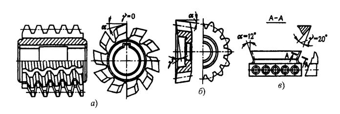 Червячная модульная фреза (рис.2.3.2,а) представляет собой винт с прорезанными перпендикулярно к виткам канавками. В результате этого на червяке образуются режущие зубья, расположенные по винтовой линии. Профиль зуба фрезы в нормальном сечении имеет трапецеидальную форму и представляет собой зуб рейки с передним γ и задним α углами заточки. Червячные фрезы изготовляют однозаходными и многозаходными. Чем больше число заходов, тем выше производительность фрезы, но ниже точность. Червячными модульными фрезами нарезают цилиндрические колеса с прямыми и косыми зубьями и червячные колеса.