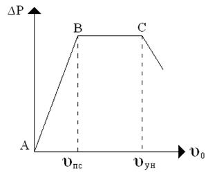 Переход неподвижного слоя в кипящий происходит при такой скорости ожижающего агента υпс , когда гидродинамическое давление потока Р уравновешивает силу тяжести G, действующую на частицу. При дальнейшем увеличении скорости слой вначале расширяется при неизменном гидравлическом сопротивлении ΔP, а при достижении условия P>G частицы начинают выноситься из слоя. Пока слой неподвижен, P возрастает при увеличении υ0 (участок АВ). После точки В, соответствующей переходу слоя во взвешенное состояние, сопротивление слоя не изменяется при росте скорости (участок ВС). После точки С, соответствующей началу уноса частиц твердого материала, сопротивление слоя падает. Скорости ожижающего агента, соответствующие точкам В и С, называются скоростью псевдоожижения υnc и скоростью υун уноса соответственно. Отношение υnc/υун называется числом псевдоожижения, характеризующим интенсивность перемешивания частиц в кипящем слое. Основные параметры кипящего слоя могут быть вычислены по полуэмпирическому уравнению: