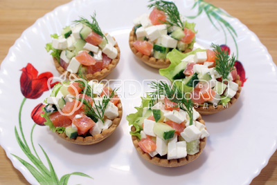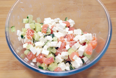 Сыр, огурец и рыбу нарезать небольшими кубиками и смешать в миске.