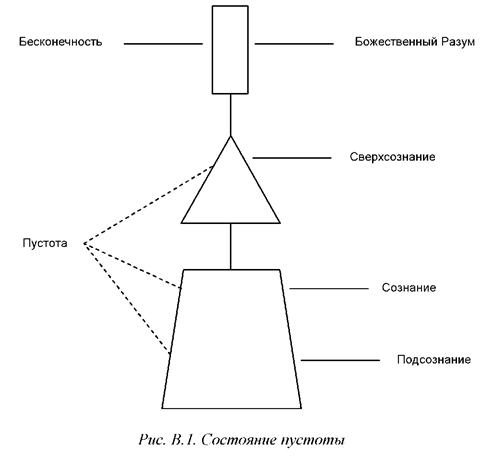 Пустота - это основа самоаутентичности, разума и Космоса. Это состояние, предшествующее «вливанию» вдохновения от божественного Разума в подсознание (см. рис. В.1). Все учёные знают, что Космос возник из ничего и вернётся в ничто, когда придёт время. Вселенная начинается и заканчивается нулём.
